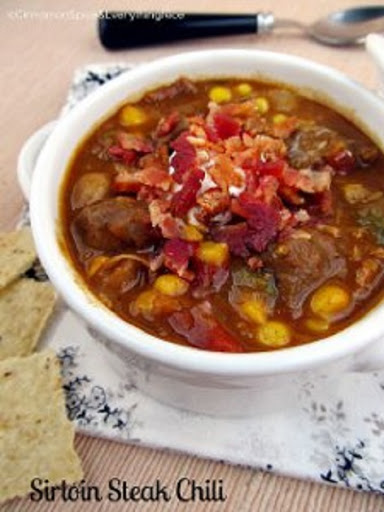 Add spices and crumble half the bacon back into the pan. Stir well and cook 1-2 minutes. Add tomatoes, beans and corn. Season again with salt and pepper. Simmer 35-45 minutes or until steak is tender. Taste often and season as needed.