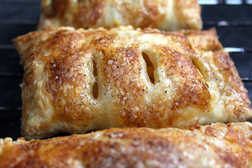 Working with 1 pastry rectangle at a time (keep the rest in the fridge), place on a work surface and brush edges with egg wash. Scoop 3 tablespoons of the apple mixture onto one side; fold dough over filling so that short ends meet, forming a 5-by-3-inch packet. Crimp edges with a fork to seal. Using a sharp knife, cut a few slits in top of pie to vent. Place on parchment-lined baking sheet; repeat with remaining dough and filling.