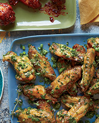 3. Add the crispy wings to the green sauce and toss well. Transfer to a platter and serve hot.
