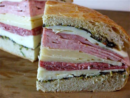I don’t believe in sandwiches without mayo, seems unfair to the bread. Unless of course said mayo is replaced by the ridiculous olive spread on this here muffaletta.