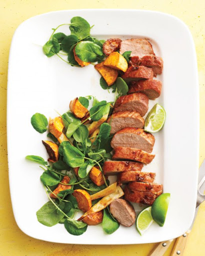 Toss vegetables with watercress, drizzle with olive oil, and season. Thinly slice pork and serve with any accumulated juices from sheet, the salad, and lime wedges.