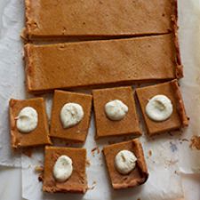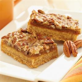 These Pumpkin Praline Bars make a perfect treat for the Fall - or anytime of year. The cookie crust is crumbly with a wonderful pumpkin flavor, the topping is similar to pecan pie. I'm surprised you don't see this flavor combination more often, it tastes awesome!