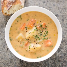 1. Cook bacon in Dutch oven over medium heat until fat has rendered and bacon is nearly crispy, 7 to 9 minutes. Add leeks, carrots, celery, thyme, and 1 teaspoon salt and cook until leeks are translucent, about 8 minutes. Add potatoes and cook, stirring constantly, until starch begins to release and coat vegetables, about 2 minutes. Add garlic and cook until fragrant, about 30 seconds. Add broth and bay leaf and bring to boil.