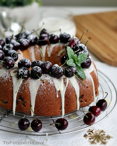 Once the cake has cooled, combine the ingredients for the orange glaze icing in a bowl until you get a smooth mixture that is not too runny. Drizzle the cake with the glaze and arrange fresh cherries on top. Add a sprig (or more) of mint leaves. Dust liberally with icing sugar. This cake is best served slightly warm (a few seconds in the microwave works great!).