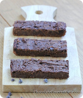 Homemade Chocolate Protein Bars: Preheat the oven to 350 F. Combine all ingredients except chips in a high-quality food processor, and blend until absolutely and completely smooth. (A blender works if you absolutely must, but the texture and taste will be much better in a food processor.) Stir in the chocolate chips. Pour into a greased 8×8 square pan. Optional: sprinkle extra chocolate chips over the top. Cook the homemade chocolate protein bars 16 minutes. They will still look underdone when you take them from the oven, but this is okay. Let cool, then pat down with a pancake spatula. Refrigerate overnight. The bars will have firmed up and are now ready to cut and eat. Store leftovers in the refrigerator. Makes about 10 bars.