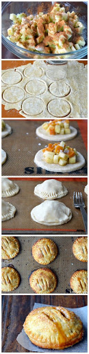 Place six of the dough circles on a Silpat or parchment paper-lined cookie sheet. Spoon a small portion of the apple filling into the center of each circle, leaving enough of a border around the filling. Top the apple filling with a portion of the chopped caramels and a pinch of sea salt. Place a second dough circle atop each filled circle then use a fork to crimp the edges together, sealing each pie.