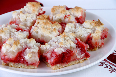 1.While crust is baking, wipe out processor and add egg whites. Mix until doubled in volume and slightly firm. Add extract, Almond Paste and powdered sugar. Mix until smooth. Add coconut flakes and mix until combined. Transfer coconut mix to a bowl.