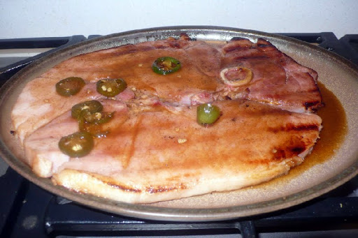 Grill ham steak on direct medium heat w/sliced jalapenos on one side for approx 3 minutes with lid down. Turn and grill an additional 3 minutes and remove to platter. Serve with sauce.