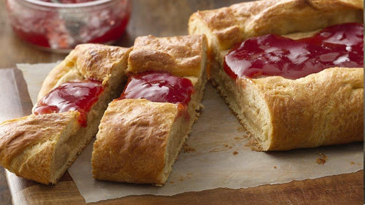 Bake 25 to 35 minutes or until golden brown. Cool 10 minutes. Spoon and spread jam down center of pastry. Carefully remove to serving plate. Serve warm.