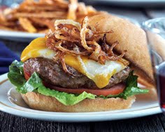 Diner Burgers with Cheddar, Frizzled Onions & Smoky Sweet Potato Straws