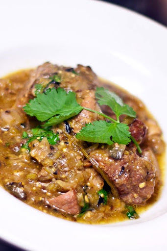 Turn down heat to medium low and partially cover the pot with a lid (leaving room for steam to escape). Simmer for 3-4 hours or until the meat falls apart when a fork is inserted. During the last 30 minutes of cooking, simmer with the lid off allowing the chile to thicken (should be about the consistency of salsa). Salt and pepper to taste and serve with warm (preferably home-made) tortillas.