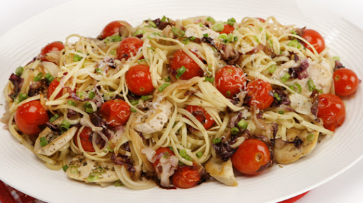 Add tomatoes, onion, garlic, oregano and remaining oil, salt and pepper to skillet; saute for 2 minutes. Add radicchio; saute until tomatoes begin to split and soften, about 2 minutes. Return chicken to skillet; add green onions and heat through.
