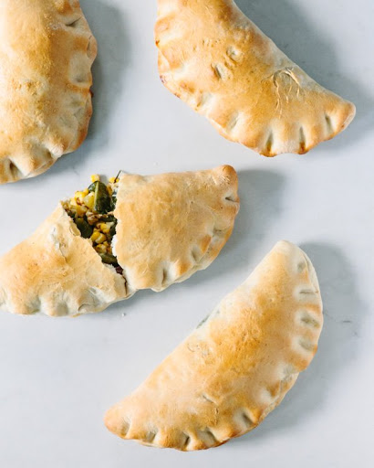 On one half of each dough circle, add some shredded cheese, then vegetables, then more cheese, making sure to leave around 1 inch on the edge. Fold the other half of the dough over so that the calzone forms a half-moon shape. Crimp the edges together.