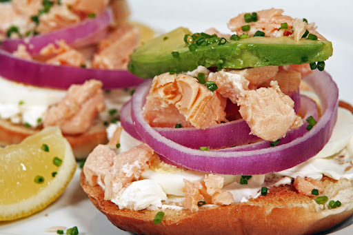 To assemble, evenly spread cream cheese on toasted bagel halves. Divide sliced egg and place on top each cream cheese bagel half and then top with red onion. Break salmon fillet into bite size pieces and divide evenly to top bagel halves. Finish with avocado, chives, salt and pepper. Add lemon wedge for fresh squeeze of lemon juice on bagel if desired.