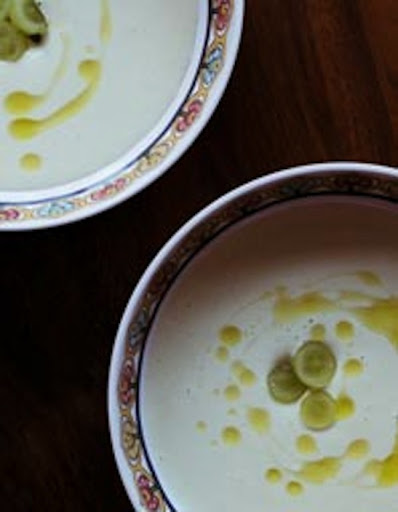 2. Using a blender, purée the almonds, 2 cups ice water and the salt on high speed until smooth. Add the garlic and shallot and purée, then add 2¼ cups of the grapes, the cucumber and soaked bread and process until totally smooth.