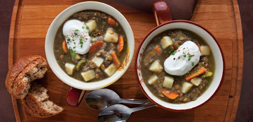 Pour into hot bowls and serve with a dollop of sour cream (optional).