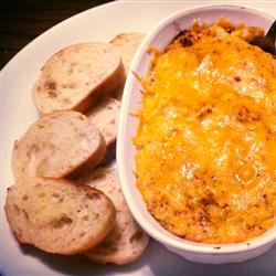 3.Transfer the mixture to the prepared baking dish. Top with remaining Cheddar cheese and seafood seasoning. Bake in the preheated oven 30 minutes, or until bubbly and lightly browned.