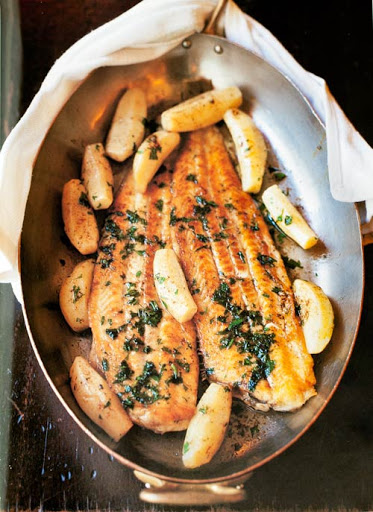 Dover sole is an unforgettably flavored, albeit unfortunately pricey, fish. Firm and flat, it’s perfect for pan-frying. If you prefer the flavor of butter to the delicate nuance of sole, by all means, sauté the fillets in butter and then drench them in the nutty brown butter sauce. But after paying all that for these fillets, if you prefer to retain a little more of the fish’s innate flavor, then you probably ought to opt for searing them in olive oil. Or do what we do, and substitute the relatively affordable and available flounder to great effect.