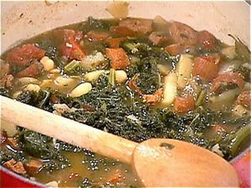 Add garlic, bay leaves, and kale to the pot. Cover pot and wilt greens 2 minutes. Season with salt and pepper. Add beans, tomatoes, chourico, and broth to the pot and bring soup to a full boil. Reduce heat back to medium and cook 5 to 10 minutes longer or until potatoes are tender.