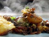 Set a large saute pan over medium heat and add a 2 count of olive oil. Cut bacon into long strips and add to pan together with thyme. Cook for 5 to 7 minutes to render the fat then strain and set aside. Add Brussels sprouts, potatoes and pearl onions. Season with salt and pepper and cook until slightly browned. Add chicken stock and steam for 3 to5 minutes until liquid has evaporated and vegetables are tender. Add balsamic vinegar and toss to coat. Cook until balsamic has reduced then fold in fresh parsley and bacon.