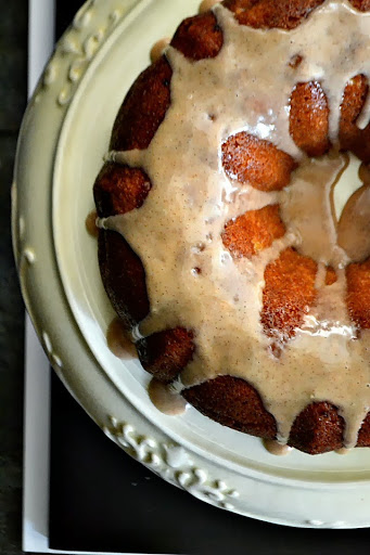 To make the glaze, whisk powdered sugar, maple syrup and apple pie spice until smooth. Pour in milk just a little bit at a time until desired consistency. Drizzle over the top of the cake and serve.