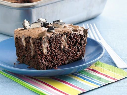 3 Stir 1/4 teaspoon peppermint extract into frosting. Spread frosting over top of cake. Sprinkle with peppermint patties. Store covered in refrigerator.