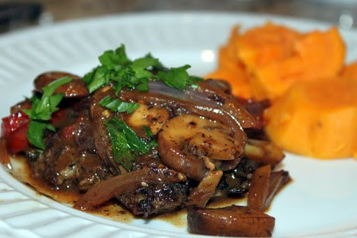 Serve the steaks with the gravy ladled over the top and garnished with diced flat leaf Italian Parsley.