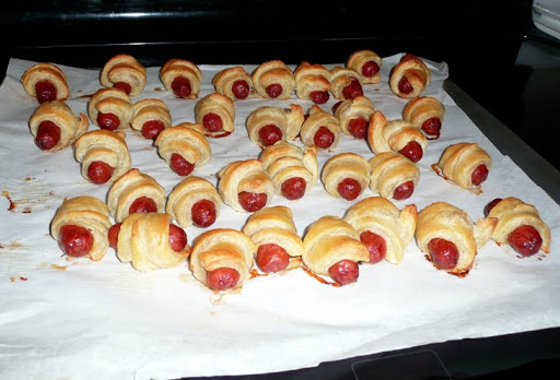 Lay each hot dog along the 1-inch edge, and roll down to the point. Place on a parchment-lined baking sheet, brush the tops with a simple egg wash, and bake at 400 degrees for about 10 minutes, or until the pastry is golden brown. Serve with grainy mustard (or yellow mustard for kids).