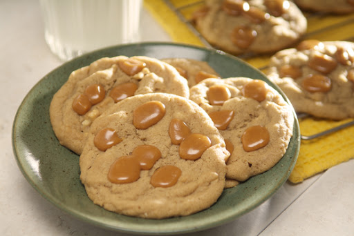 3. Chill dough for 30 minutes. Drop by rounded tablespoonful onto cookie sheet. Bake 10 minutes (cookie will be soft and just barely done). Cool on cookie sheet for 1 minute then top each cookie with chopped caramels pressing caramel pieces into the top of each cookie. Let stand 5 minutes before removing to wire rack to cool.
