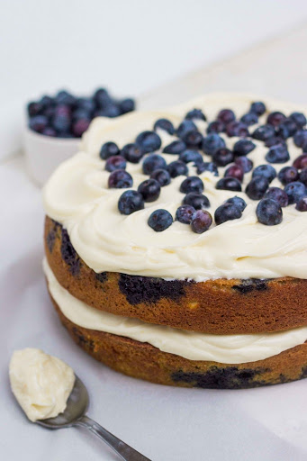 12.Once the cakes are cooled, top one of the cakes with half of the frosting, then top with the other cake and spread with the remaining frosting. I used the back of a spoon to make attractive waves. Top with additional fresh blueberries.