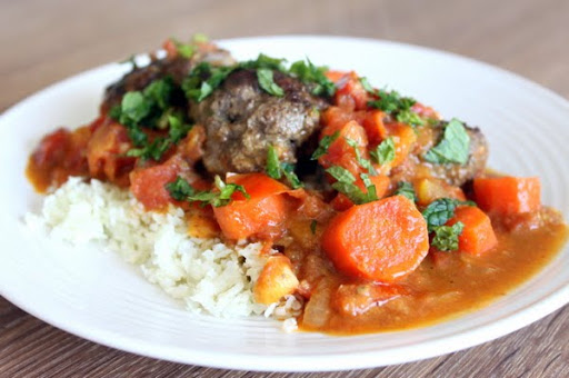 Serve over grated, steamed cauliflower and garnish with fresh mint.