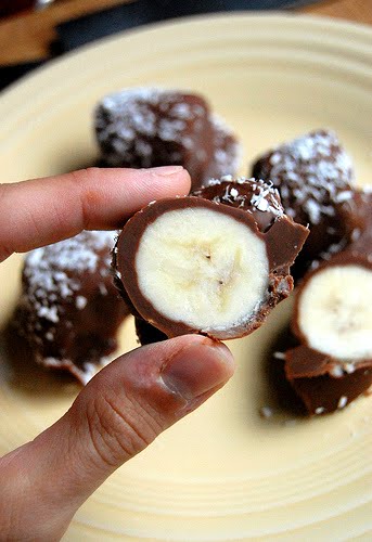 4. Dip the banana pieces in the chocolate-peanut butter mixture. Lay them out leaving some space between them on the parchment/wax paper. Then when you’ve “covered” them all, use the remaining mixture to spoon over the tops (for even more chocolate-y goodness).
