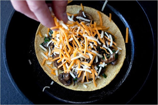 Place a corn tortilla in a pan. Top with half the mushrooms, and spread in an even layer. Sprinkle on half the cheese. Turn the heat to medium-high, and heat until the cheese begins to melt. Place another tortilla on top of the cheese, and press down lightly. Flip the quesadilla over in the pan, and heat for about 30 seconds or until the cheese has melted. Flip back over, and remove to a plate.