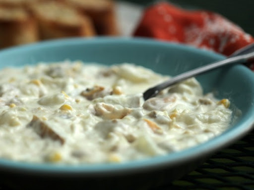 Drain the potato water into the reserved clam juice and add the diced potatoes to the reserved clams. Remove the kernels from the corn cobs, and then add the kernels to the clams and potatoes.