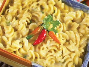 5.Stir in cheese until melted. Stir in sour cream. Pour over pasta; stir to coat. Spoon into greased shallow 2-quart baking dish.
