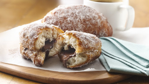 Separate dough into 8 biscuits. Press each biscuit into 4-inch round. Spoon 1 tablespoon of the mocha cappuccino hazelnut spread on each biscuit. Fold dough over filling; press edges to seal.