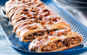 Unroll dough onto sprayed baking sheet; firmly press edges and perforations to seal. Press to form 13x7-inch (33x 18 cm) rectangle. Spread filling in 3 1/2-inch (9 cm) wide strip lengthwise down centre of dough rectangle to within 1-inch (2.5 cm) of ends.