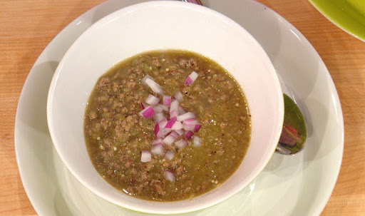 Heat a Dutch oven over medium-high heat with the oil until smoking. Brown and crumble the beef then add garlic, salt, pepper, cumin and coriander, and stir to toast. Stir in peppers and onions, the tomatillo purée and remaining stock. Simmer a few minutes to thicken and adjust seasoning.