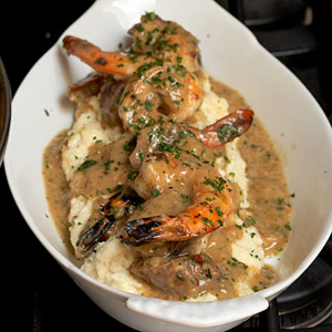 3.Preheat the grill to medium-high. Quickly and carefully wipe the grate with oiled paper towels to create a nonstick surface. Season shrimp with plenty of salt and pepper. Place shrimp on grill; cook for 1 to 2 minutes per side until shrimp turn pink. Fold the grilled shrimp into the sauce. Add the cayenne pepper, hot sauce, and lemon juice. Season with salt and pepper. Stir in the parsley and chives. Serve shrimp on top of the grits with Buttermilk Biscuits.