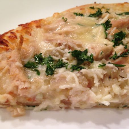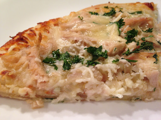 Preheat oven to 450*. Place a thin layer of garlic paste on pizza. Sprinkle mozzarella cheese over paste. With a slotted spoon, scoop shallot mixture on pizza, add chicken, Romano cheese and parsley. Place pizza on middle rack and bake until crust is crisp and cheese is melted, approximately 10 minutes.