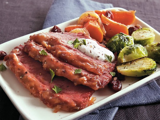 4.Remove beef from slow cooker to serving platter; cut across grain into thin slices. Spoon carrots and onion around beef. Drizzle with cooking liquid, if desired. Sprinkle with parsley and pepper. Serve with horseradish sauce.