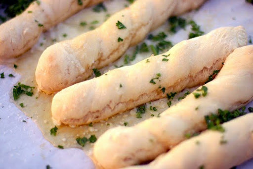 As soon as you remove your breadsticks from the oven, mix together the melted butter, garlic powder, sea salt, and grated parmesan. Drizzle oven hot breadsticks. Sprinkle with fresh chopped parsley and serve immediately.