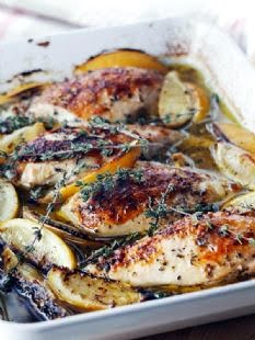 Pat the chicken breasts dry and place them skin side up over the sauce. Brush the chicken breasts with olive oil and sprinkle them liberally with salt and pepper. Cut the lemon in 8 wedges and tuck it among the pieces of chicken.