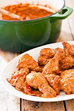 Bone-in, skin-on chicken pieces gave us the best flavor of all the possibilities we tested. If left on, the skin imparted an unwelcome greasiness to the sauce. This was easily remedied by discarding the skin after browning the chicken.