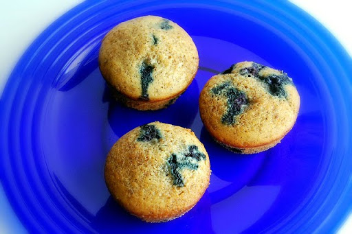 In a large mixing bowl, whisk together ground flax, egg whites, egg, brown sugar, oil, lemon juice, honey, lemon zest, vanilla, baking powder, baking soda and salt until well combined. Whisk in milk and flour until just combined; stir in blueberries until combined.