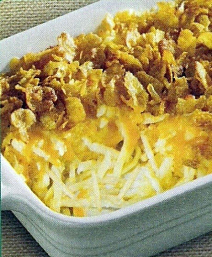In large bowl combine all hash brown ingredients; mix well. Spread into two quart (11 X 17 or 8 inch square) greased glass baking dish. In small bowl stir together topping ingredients. Spread topping evenly over hash browns. Bake in a preheated 350 degree oven for 45 minutes or until hash browns are tender
