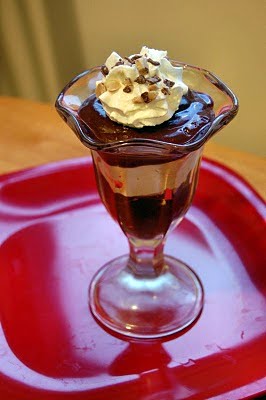 4. To assemble. First put a layer of pudding into cup, then a thin layer of chopped walnuts, then sprinkle a few chocolate chips. Next, spread a layer of peanut butter, then cover with chocolate pudding. Top with whipped cream and sprinkle peanuts on top.