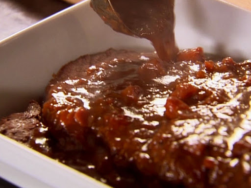 Remove the roast to a cutting board. Remove the herb bundle and discard. Skim off as much fat as possible from the sauce. Transfer half the sauce and vegetables to a blender or a food processor fitted with the steel blade and puree until smooth. Pour the puree back into the pot, place on the stovetop over low heat, and return the sauce to a simmer. Place 2 tablespoons flour and the butter in a small bowl and mash them together with a fork. Stir into the sauce and simmer for 2 minutes, stirring until thickened. Taste for seasonings. Remove the strings from the roast, and slice the meat. Serve warm with the sauce spooned over it.