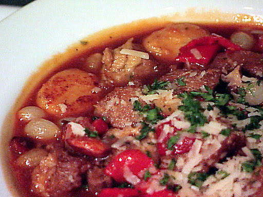 Heat a saute pan over medium-high heat. Add 1 to 2 tablespoons olive oil, then pork and gnocchi. Saute until the gnocchi is slightly golden. Add remaining ingredients (except almonds and parsley) and reduce the liquid by 1/2. Finish with almonds and garnish with chopped parsley.