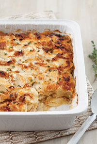 4.Arrange one-fourth of potato slices in the bottom of the baking dish. Spread one-fourth milk mixture over potatoes. Sprinkle one-fourth onions over sauce. Repeat layers 3 more times. Sprinkle cheese on top of potatoes before baking. Cover with aluminum foil.